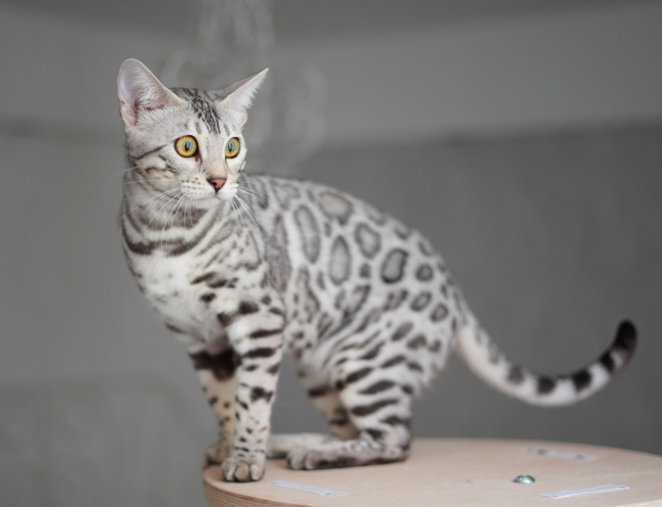 The silver inhibitor gene absorbs every brown undertone transforming the Bengal coat to a majestic silver shade